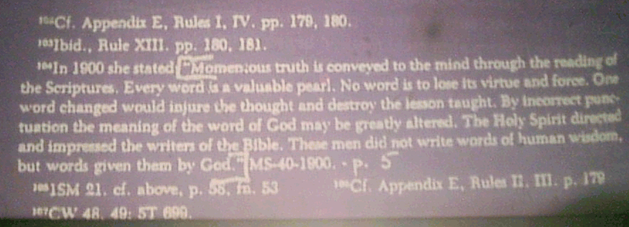 "Momentous truth is conveyed to the mind through the reading of the Scriptures. Every word is a valuable pearl. No word is to lose its virtue and force. One word changed would injure the thought and destroy the lesson taught. By incorrect punctuation the meaning of the word of God may be greatly altered. The Holy Spirit directed and impressed the writers of the Bible. These men did not write words of human wisdom, but words given them by God." MS-40-1900.